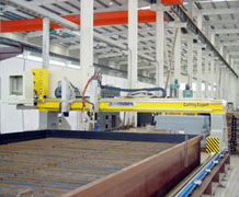 對(duì)于大于8mm的厚板件制作,如:伸縮橫梁、底座旋轉(zhuǎn)法蘭、滑行導(dǎo)軌等工件,我們?cè)谏a(chǎn)過(guò)程中采用數(shù)控等離子切割機(jī)(圖六)下料、割榫,加工出的工件變形小、尺寸精確、工藝簡(jiǎn)化,既保證了產(chǎn)品質(zhì)量,又提高了生產(chǎn)效率,縮短了生產(chǎn)時(shí)間。